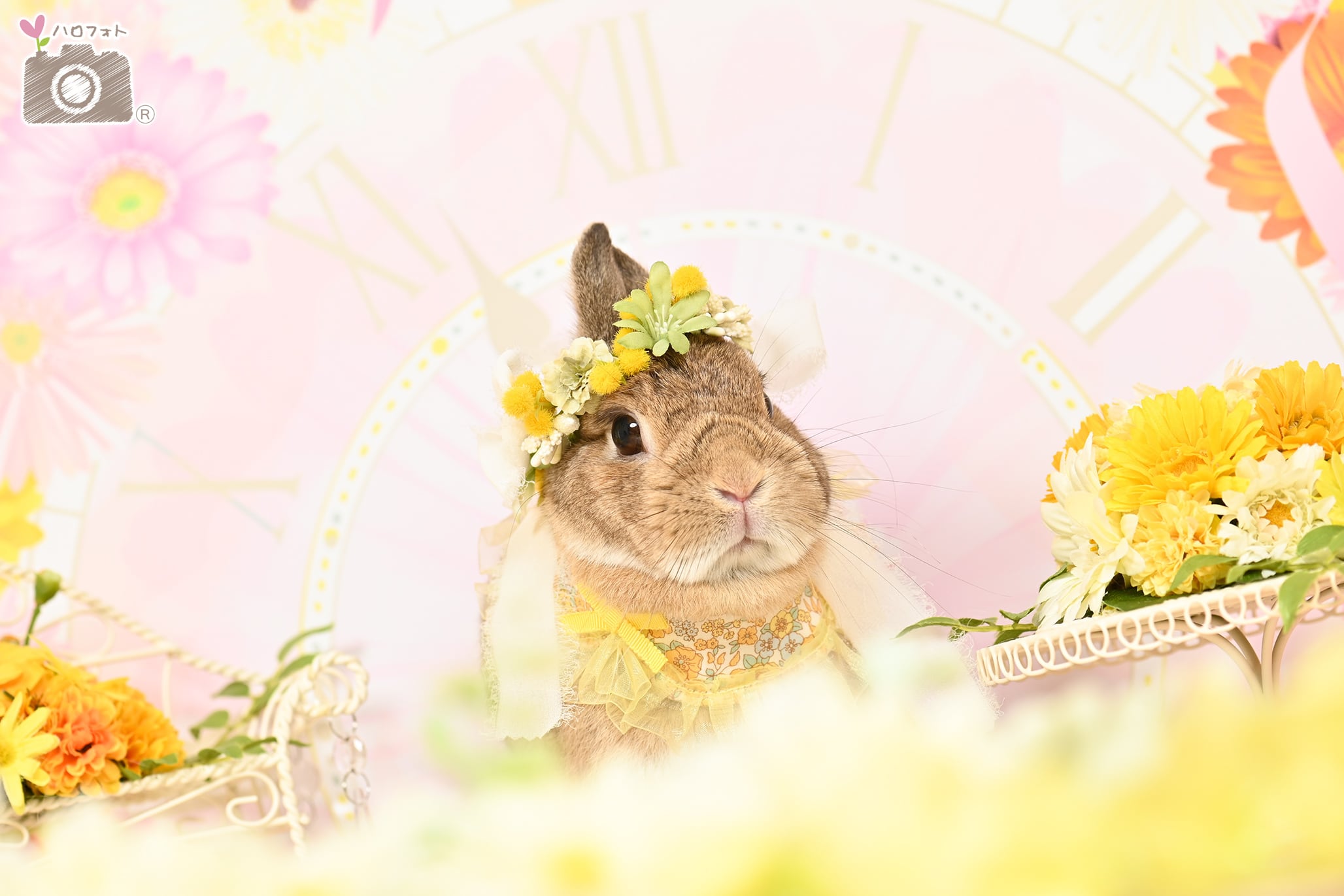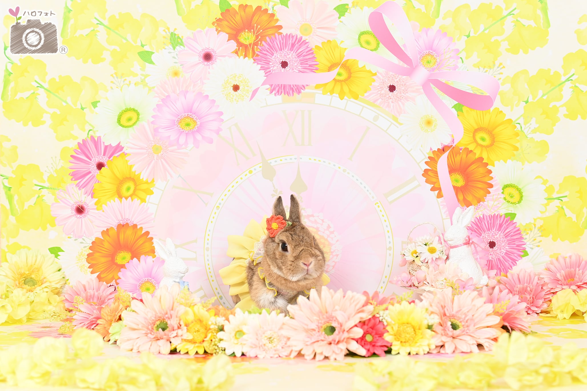 ガーベラの花言葉は「希望」「常に前進」「前向き」。 今回はそんな素敵な花言葉を持つガーベラで、花時計を作りました。 花時計の中から、愛うさちゃんが可愛い時間をお知らせしてくれます。