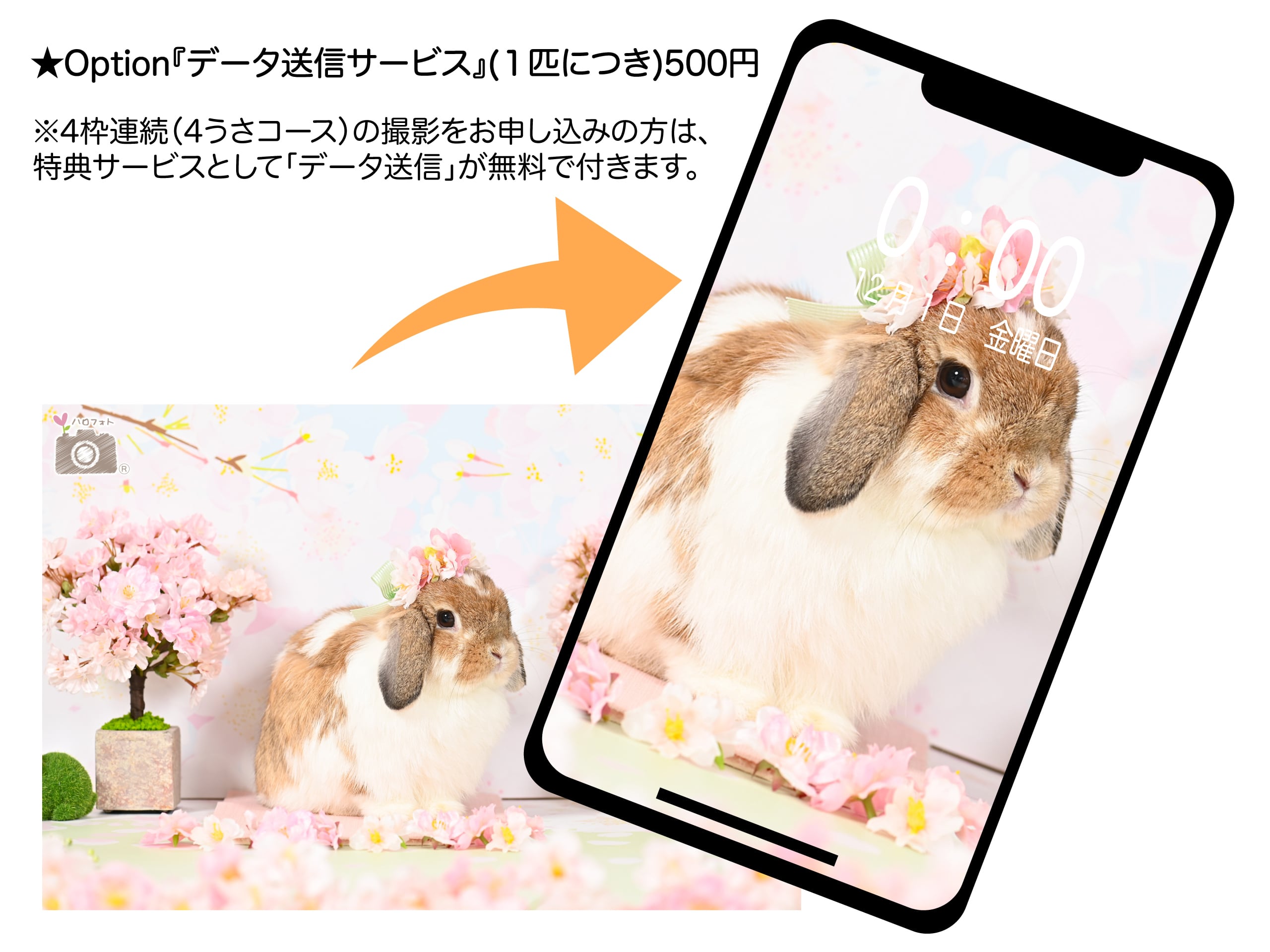 ※4匹うさぎさん(4枠連続)の撮影をお申し込みの方は、特典サービスとして「データ送信」が無料で付きます。